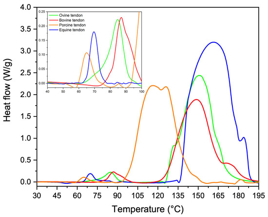 Representative thermograms of equine extensor (blue), bovine (red), porcine (orange) and ovine (green) tendons.