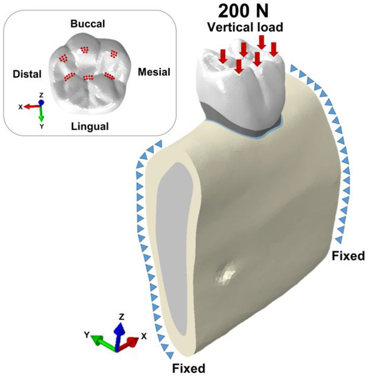 As shown in Figure 3, a vertical load of maximum biting force 200 N was applied to a total of 50 nodes, and a force of 4 N per node was applied [26]. Tie conditions were applied between the interface of all parts, and contact conditions were not considered. Both sides of the cortical and cancellous bone sections were fixed in all directions (X, Y, Z).
