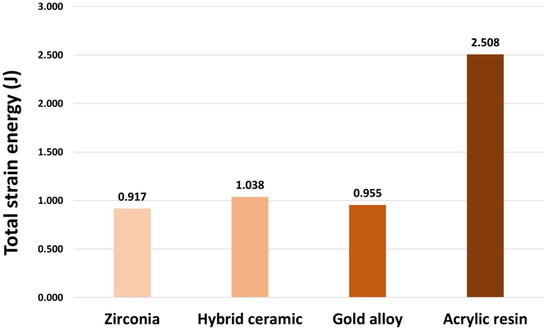 The total strain energy of the structure under the prescribed loading and boundary conditions is an effective global stiffness measure with lower strain energy indicating higher stiffness. The whole model stiffness during the simulation was estimated by measuring the total strain energy. Figure 4 shows the analysis results of the strain energy values on the whole model. The model with the highest strain energy measured was the acrylic resin model (2.51 J) combined with the tooth with temporary cement, and the highest energy was measured in the following order: hybrid ceramic (1.04 J), gold alloy (0.95 J), and zirconia (0.92 J).