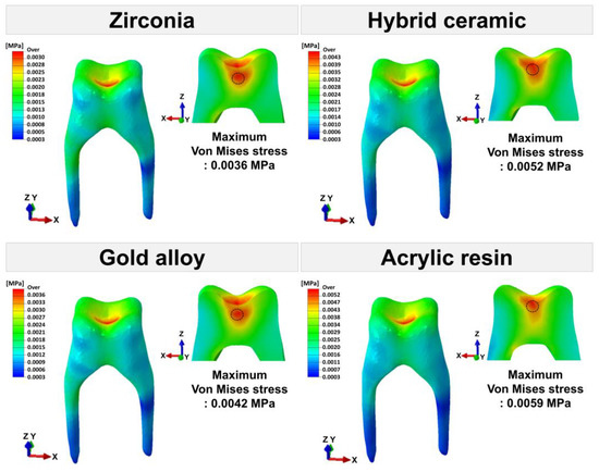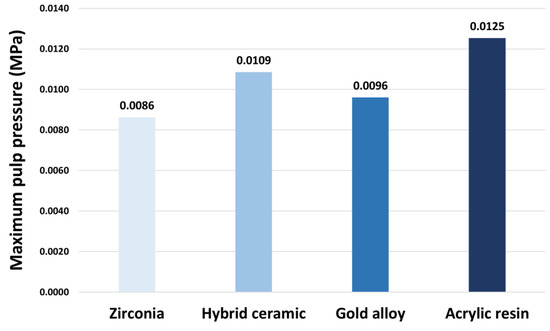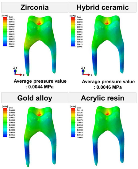 The maximum and average pressure values applied to the pulp were calculated (Figure 5 and Figure 6). The average pressure value did not show a significant difference, and the maximum pressure value was higher in the order: acrylic resin (0.0125 MPa), hybrid ceramic (0.0109 MPa), gold alloy (0.0096 MPa), and zirconia (0.0086 MPa).