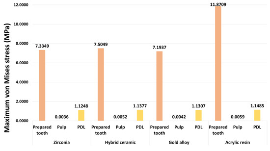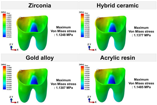 The model with the highest stress in the tooth tissue was the acrylic resin model. Among them, the highest stress value was shown in the prepared tooth (11.8709 MPa). The prepared tooth of the acrylic resin model showed about 1.6 times higher stress values than those of the other models. In the other models, high stress values occurred in the following order: hybrid ceramic (7.5049 MPa), zirconia (7.3349 MPa), and gold alloy (7.1937 MPa). The position of the maximum stress value of the prepared teeth was different for each model. The maximum stress value occurred at the mesial margin in the zirconia model, the pulp chamber region in the hybrid ceramic and gold alloy model, and the distal margin in the acrylic resin model (Figure 5). In pulp, the highest stress value occurred in the acrylic resin model (0.0059 MPa), followed by hybrid ceramic (0.0052 MPa), gold alloy (0.0042 MPa), and zirconia (0.0036 MPa). The area where the maximum stress value appeared in the pulp was the pulp chamber, which was similar in all models (Figure 5). In PDL, the highest stress value occurred in the acrylic resin model (1.1485 MPa), and, like pulp, the stress value was high in the following order: hybrid ceramic (1.1377 MPa), gold alloy (1.1307 MPa), and zirconia (1.1248 MPa). The area where the maximum stress value appeared in PDL was the top of the mesial and was similar in all models (Figure 6). In addition, in all crown models, the highest stress values appeared in the following order: prepared tooth, PDL, and pulp.