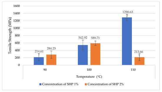 - A significant increase in tensile strength was observed more than 19 times when CA/SHP 1% was treated at an activation temperature of 110 °C with a superior tensile strength of 1290.63 MPa. Unfortunately, the effectiveness of CA/SHP crosslinks has not been successfully applied to ramie fibers that have been processed by degumming or that have been spun into yarn.