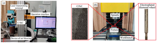 Carbon fiber composite material is a new type of material which is composed, of carbon fiber as reinforcement and resin, ceramic, and metal as matrix, through a special process [1,2]. The properties of the composite material are also different due to different matrix [3]. Among them, C/SiC composites not only possess the characteristics of high modulus, light weight, and good toughness of carbon fiber materials, but also possess the characteristics of high hardness, high fatigue resistance, and high temperature resistance of SiC materials [4,5,6,7]. C/SiC composites are listed as the preferred materials for high-performance friction materials and thermal protection structural parts of aerospace vehicles [8]. These composites are used in brake pads for high-end cars and planes, thermal protection systems, and thermal protection panels for aircraft, blades and nozzles for rocket engines, and substrates for space telescopes [9,10,11,12,13,14,15]. However, due to the high brittleness, wear resistance, and anisotropy of C/SiC composites, it is difficult to process with precision [16].