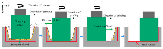 The scheme of grinding processing was designed in Figure 5. Firstly, the grinding wheel was moved along the Y+ direction to the center of the ablation groove, and moved along the Z+ direction to contact the groove bottom, and then, the bottom of the grinding wheel was tooled at the center of the ablation groove bottom. Secondly, the grinding wheel was moved to the end face of the groove along the X- direction, the processing allowance and ablative oxide layer on the surface of the groove was removed by grinding wheel outwards and inwards from the workpiece end face, and, according to the calculation, the depth of the groove reached the ideal size when grinding n times. Then, the grinding wheel was moved to Y- with cutting depth of 50 μm each time, and the groove was ground from the workpiece end face from outside to inside, the sidewall taper of the left groove was removed after grinding y1 to the left. Finally, the grinding wheel was moved y1 mm along the Y+ direction, it began grinding to the right side of the groove, the right-side wall taper of the groove was removed when ground y2 to the right, and the width of the groove was qualified when ground y3 to the right.