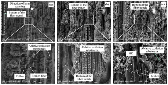 The microscopic morphology of 2.5-dimensional C/SiC composite grooves after laser ablation was investigated with the laser power of 80 W, scanning speed of 300 mm/s, scanning spacing of 20 μm, scanning times of 20, and scanning frequency of 50 kHz, as shown in Figure 8. As can be seen from Figure 8a,b, a large number of powder, loose, and porous ablative oxidation substances appeared on the bottom surface of the ablation groove, the carbon fiber and silicon carbide matrix were almost covered, with only a few fibers and matrix materials leaking out, and the trench bottom of fiber could be found on the bottom surface of grooves, and it was hypothesized that the appearance of this structure was caused by two factors: firstly, the thermal diffusion rate inside the material was not uniform, and the conduction rate along the fiber direction was faster than that in other directions [42]; secondly, when ablating, the diffuse reflection was produced on the surface of the processed material so that less carbon fiber or matrix material received more energy, and thus more material was removed [43]. The same phenomenon was found in Figure 8c, where the bottom of the fiber trench could be observed, and the carbon fiber and silicon carbide matrix were almost covered, but some of the transverse fibers were found to be barely leaking out from the local magnified view, and the fibers and silicon carbide matrix were not uniformly removed at the same time, this was due to the different properties of carbon fiber and silicon carbide matrix materials, the sublimation temperature of SiC matrix was 2700 °C, while the sublimation temperature of carbon fiber was 3550 °C, which was higher than that of SiC, therefore, the carbon fiber was in an incomplete sublimation state and the ablation rate of SiC matrix was faster than that of C fiber [44]. In addition, fiber fragmentation was observed away from the fiber breaks, which was due to the different ablation properties of the various carbon fiber sections [21].