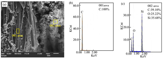 In order to confirm the composition of material adhering on the groove surface after laser ablation of 2.5-dimensional C/SiC composites, the EDS composition analysis was performed at random detection locations in the bare-leakage carbon fiber and material covered areas. As shown in Figure 9, only carbon elements were detected on the bare leaking carbon fiber surface, while C, O, and Si elements were detected in the material covered area, where the percentages of C, O, and Si contents is 39.10%, 25.22%, and 35.68%, respectively. The results indicated that the composition of substances adhering to the C/SiC composites ablation groove surface were silicon oxygen compounds and silicon carbide, this was because C/SiC composites underwent a series of physicochemical reactions under the action of high local temperature for the laser beam, with the accumulation of heat and the increase in temperature, the carbon fiber reached its sublimation temperature and formed carbon vapor, and the part of silicon carbide matrix reached its decomposition and sublimation temperature, and the cracked Si (g) was oxidized to generate a large amount of hot SiO2 gas and a small amount of SiO (g), which was vaporized and splashed out of the groove surface, and as the temperature decreased, the groove surface was covered with gaseous SiO2 and SiO in the form of smoke dust [45].