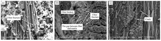 Figure 10 shows the microscopic morphology of the longitudinal fiber region, the needled fiber region and SiC region at the bottom of the ablation groove. From the longitudinal fiber region after laser ablation in Figure 10a, the clear carbon fiber fractures could be observed, the fibers and matrix were not removed at the same time, the lengths of exposed longitudinal fibers were different, and the fibers all showed the state of being mitered. In addition, as can be seen from the needle-punched fiber region after laser ablation in Figure 10b, compared with the longitudinal fiber area after laser ablation, only a very small portion of the fibers were broken, the needle-punched fiber fracture was almost flush with the SiC substrate material, and the fiber fracture surface was flat, indicating that the needle-punched fibers were removed simultaneously with the matrix; meanwhile, the gap between fiber and matrix was found. From Figure 10c, it can be seen that cracks appeared on the surface of the SiC matrix, which was because of the Gaussian distribution of laser energy, with high energy in the center of the spot and low energy at the edges, and the surface temperature of the central irradiation area raised rapidly, resulting in the material in the center of the ablation area being melted, while the material at the edges of the ablation zone was not yet melted, resulting in a strong thermal stress concentration, and when the stress accumulated to a certain limit, the surface of the SiC substrate cracked or even the surface broke off [46].