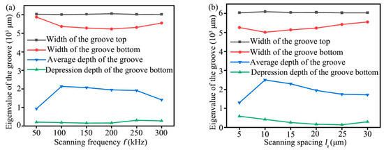 Figure 11. Relationship between different laser processing parameters and the eigenvalue of groove (a) Scanning frequency, (b) Scanning spacing.