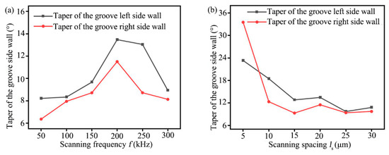 The taper of the ablation grooves side wall with different laser scanning frequency and scanning spacing can be calculated by Equation (3), as shown in Figure 12. From Figure 12a, it can be seen that when the scanning frequency increased from 50 kHz to 300 kHz, the taper of the groove side wall increased first and then decreased with the increased scanning frequency, and the taper of the groove left side wall was larger than that of the right side wall, and when the scanning frequency was 50 kHz, the taper of groove both left and right sidewall were the minimum value. From Figure 12b, it can be seen that when the scanning spacing was 25 μm, the taper of the groove left side wall reached the minimum value of 9.3172° and the taper of the groove right side wall reached the minimum value of 9.3943°. Mostly, the taper of the groove left side wall was larger than the taper of groove right side wall in the experiment, it was because of the accumulation of laser heat when ablating from left to right, and the temperature was low when the ablation began at the left, and the temperature was high when the ablation process reached the right [24].