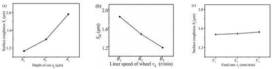 Figure 13. Response curve of the surface roughness Sa. (a) Depth of cut, (b) Liner speed of wheel, (c) Feed rate.