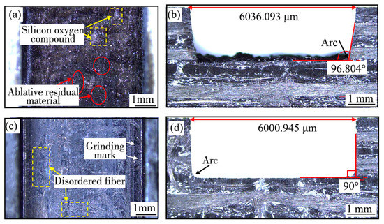 The macroscopic morphologies of the bottom and end cross section of the processed C/SiC composites grooves are shown in Figure 14. As shown in Figure 14a,c the bottom of the ablation C/SiC composite groove was uneven, the random distribution of white bright silicon oxygen compound and black ablative residual material could be observed on the bottom, while the bottom of the C/SiC composite groove after laser-grinding chain processing was flat, the white bright silicones and the black ablative residues were completely removed, and some disordered fibers were observed at the groove bottom, this was presumably because disordered fiber layer was ground at the end of grinding, and the fibers in different fiber areas were distributed at arbitrary angles in the disordered fiber layer. In addition, some deep grinding marks were formed on the processed surface of the groove bottom [47]. As shown in Figure 14b,d, the angle between the bottom and the sidewall of the ablation groove was 96.804°, and the actual width of the groove top was 6036.093 μm, which was larger than the standard groove size of 6000 μm. Moreover, the uneven surface could be observed on the groove bottom. However, the angle between the bottom and the sidewall of the groove by the laser-grinding chain processing was about 90°, and the actual width of the groove top was 6000.945 μm, which was approximately equal to the ideal groove size, the flatness and dimensional accuracy of the groove were obviously better than that of the ablation groove, besides, only the arc which affecting the shape accuracy of groove appeared at the corner of the side wall and bottom of the groove, this was because the grinding abrasives and matrix materials were subjected to greater grinding force and more grinding heat at the junction of the bottom surface and side wall of the grinding wheel, and then, the abrasives and matrix materials were easy to be worn, resulting in the materials at the junction of the bottom and side wall of the groove could not be fully removed [37].