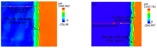 Figure 16. The two-dimensional confocal topography of the groove with different processing methods: (a) laser; (b) laser-grinding chain.