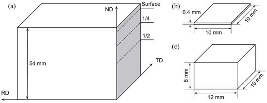 In addition, ship plate steel should also have good crack arrest properties and a small ductile–brittle transition temperature, which is strongly influenced by texture. For example, Kaneko et al. reported that the crack arrest toughness value of the steel plate at −10 °C was greater than 6000 N/mm and the ductile–brittle transition temperature was significantly lower when controlling the thermo-mechanical control process (TMCP) to form a certain proportion of specific texture components, such as <110>//X, in which X was the rolling direction [13,14]. Some research results showed that the texture intensity varied with the thickness of steel plates [15,16,17]. For example, Inagaki reported that the texture intensity increased continuously from the surface to 1/2 thickness of the low carbon steel plate [17]. Therefore, the macro-texture and micro-texture at different thicknesses of the FH36 ship plate steel were tested and analyzed in order to clarify the distribution and formation of texture in this study.