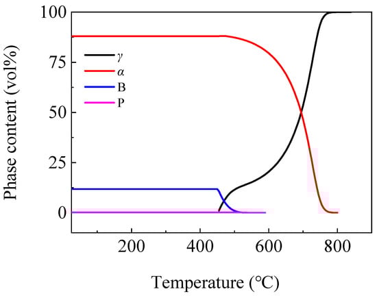 During the cooling process of steel, as the temperature decreased, the stability of austenite decreased. At a certain temperature, austenite underwent phase transformation and transformed into a ferrite, pearlite or bainite microstructure. Figure 2 shows the phases content variation with the cooling temperature after rolling in the microstructure of the steel plate using Thermo-calc software. From the figure, it can be seen that when the temperature dropped to 800 °C, the austenite (γ) phase began to transform into the ferrite (α) phase. Some of the remaining γ phase transformed into pearlite (P) below 590 °C. The remaining γ phase began to transform into bainite (B) at 540 °C, and the B transformation stopped when the rapid cooling stopped. The microstructure at room temperature contained 88% α phase, 11.8% B and a small amount of P.