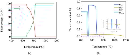 Figure 4 shows the curves of phase content variation by temperature using Thermo-Calc software. According to the figure, with the decrease in temperature, the phases appearing in the steel plate were γ, α, MC′, MC″, alloyed Fe3C and M7C3. It can be seen from Figure 4a that the γ phase began to transform into α at 829 °C, the phase transition ended at 662 °C and the α phase content was 99.17% at 400 °C. It can be seen from Figure 4b that the formation temperatures of MC′ and MC″ phases were 1165 °C and 754 °C, respectively. Their contents were 0.057% and 0.06% at 400 °C, respectively, so the sum was 0.117%. While the MC phase content was 0.1%, the two were basically the same. The alloyed Fe3C phase began to precipitate at 683 °C, reached a maximum of 0.90% at 537 °C and dissolved and disappeared at 518 °C. The M7C3 phase began to precipitate at 537 °C, and the content was 0.713% at 400 °C.