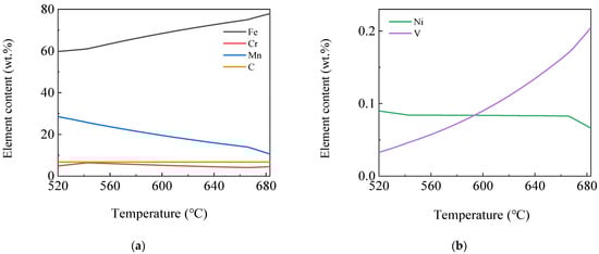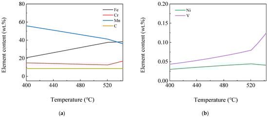 The variation of the existing elements and their contents in each phase by temperature was further and more deeply studied using JMatPro software. Figure 5 shows the curves of element content variation in the Fe3C phase by temperature. It can be seen from the figure that the main alloying elements contained in the alloyed Fe3C were Fe, Mn, a small amount of C and Cr and a trace amount of V and Ni elements. Fe and V element content in the phase decreased continuously, while Mn element content increased continuously as the temperature decreased. Cr element content increased first and then decreased, reaching the maximum at 543 °C with a content of 6.4%, and C and Ni element content varied little. The Fe element content was 60%, and the Mn element content reached 28% at 520 °C.
