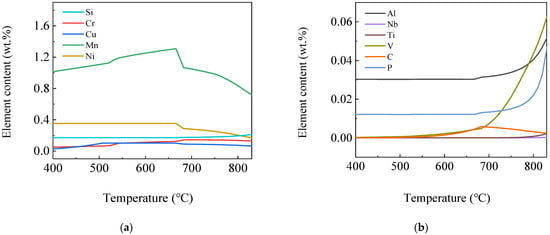 Figure 6 shows the curves of element content variation in the α phase by temperature. It can be seen from the figure that in addition to Fe element, the α phase also contained Mn, Ni, Si, Cr, Cu and trace amounts of V, Al, P, C, Ti and Nb elements, in which the Si, V, Al and P element content first decreased and then basically remained stable, while the V element content gradually decreased with the temperature. Almost no V elements were found below 600 °C. Mn and Cr element content increased first and then decreased with the temperature, and their contents were highest at 666 °C and 700 °C, respectively. With the decrease in temperature, the Ni element content increased first and then remained stable, while the Cu element content increased first and reached the maximum at 666 °C, which was 0.10 wt.%, then remained stable and decreased below 500 °C. The C element content first increased and then decreased and was low overall, reaching the maximum at 683 °C but only of 0.0058 wt.%.