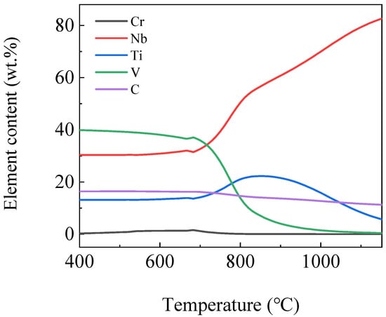 Figure 7 shows the curves of the element content variation in MC phase by temperature. It can be seen from the figure that NbC and TiC phases precipitated at high temperatures. As the temperature decreased, NbC content decreased gradually, while TiC phase content increased gradually and reached the maximum at 850 °C, then decreased gradually. NbC and TiC phases content both remained stable after reaching 700 °C. The VC phase content was low above 900 °C, and a large amount of VC phase began to form between 700 °C and 900 °C and did not increase significantly after that. CrC phase content began to increase at about 780 °C, reached the maximum at 683 °C, and then gradually decreased. The precipitated phases that existed were VC, NbC, TiC and a small amount of CrC phases or composite phases mentioned above at below 400 °C.