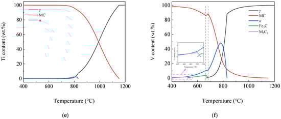 Figure 9 shows the curves of Mn, Cr, Ni, Nb, Ti and V element content variation in different phases with the temperature. As can be seen from Figure 9, at high temperatures, all the elements mentioned above were dissolved in the γ phase, and during subsequent cooling processes, they transfer from the γ phase to other phases. It can be seen from Figure 9a that when the γ phase began to transform to the α phase, the Mn element with the most content except the Fe element also began to transfer from the γ phase into the α phase in large quantities. When the α phase began to transform to alloyed Fe3C and Mn7C3 phases, part of the Mn element in the α phase was subsequently transferred into the alloyed Fe3C and Mn7C3 phases.