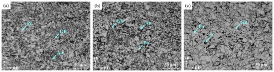 Figure 10 shows the OM images of the steel plate at the surface, ¼ thickness and ½ thickness for RD-TD section. It can be seen from the images that the microstructure was mainly composed of polygonal ferrite (Pα), acicular ferrite (Aα) and granular bainite (GB) at the surface, in which there was Pα, a small amount of Aα and GB at ¼ thickness and Pα and a small amount of pearlite (P) and GB at ½ thickness. The pearlite was formed due to the smaller deformation and slower cooling at the ½ thickness of the plate, which allowed sufficient time for the diffusion of alloy and carbon elements into the high-density region of dislocations in the deformation zone.