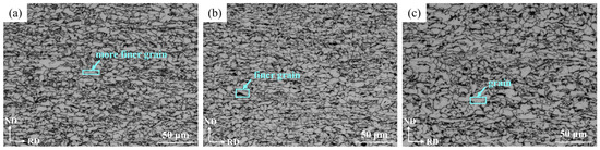 Figure 11 shows the OM images of the steel plate at the surface, ¼ thickness and ½ thickness for the ND-RD section. Because the rolling deformation gradually increased from ½ thickness to the surface of the steel plate, the grains were gradually refined and elongated along the rolling direction.