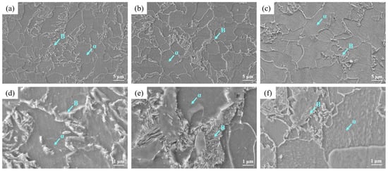 Figure 12 shows the SEM images at the surface, ¼ thickness and ½ thickness of the steel plate. The white convex phase in the figure was mainly bainite, and the relatively concave phase was the α phase. It can be seen from Figure 12a,d that the bainite formed at the surface was relatively coarse and widely distributed. It can be seen from Figure 12b,e that there were more GB formed at ¼ thickness and the distribution was relatively dense, almost only existing at the original γ phase grain boundary. Figure 12c,f shows that there was only a small amount of GB at ½ thickness.