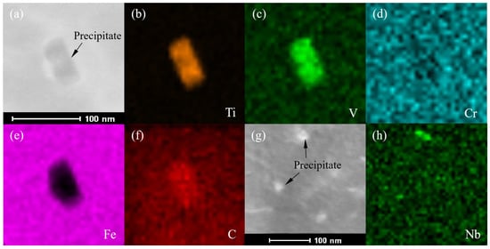 TEM of precipitated phases and the EDX of elements via plane scanning images (a–f) TiC, VC phases and contained elements; (g,h) NbC phase and contained elements.