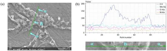 Figure 14 shows the location in the SEM image and element content distribution via line scanning in the microstructure. It can be seen from the figure that the distribution of the Mn, Cr and Ni element content in the α phase and bainite in the structure had little difference, while that of the C element content was significantly different. The C element content in bainite was higher than that in the α phase, which in bainite varied significantly from left to right, and carbides may precipitate at high C element content.