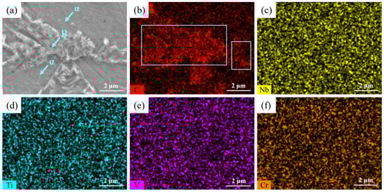 (a) SEM image and Element content distribution via plane scanning in the microstructure (b) C; (c) Nb; (d) Ti; (e) V; (f) Cr.