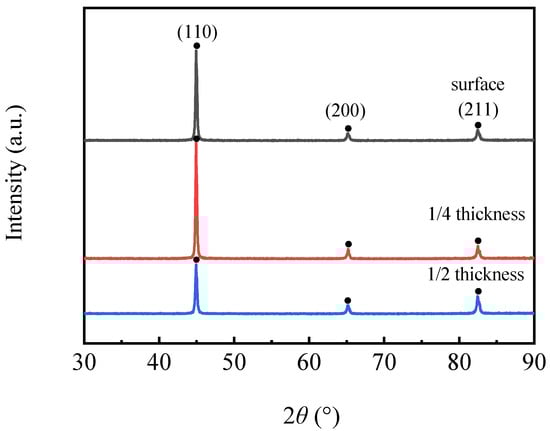 Figure 16 shows the XRD diffraction patterns at different locations. It can be seen from the figure that the positions of the diffraction peaks at different locations were basically the same, and the 2θ diffraction angles of the three peaks were about 44.93°, 65.22° and 82.51°, corresponding to (110), (200) and (211) crystal planes, respectively. The substrate had a mainly body-centered cubic structure. The diffraction intensity for the (110) plane at the surface and 1/4 thickness was significantly higher than that at 1/2 thickness. Li et al. reported that the intensity for the (110) plane was related to the rolling temperature, and the intensity was higher as a result of higher orientation density for the (110) plane at low rolling temperatures [20]. Because the rolling temperature at the surface and 1/4 thickness was obviously lower than that at 1/2 thickness, the intensity of the former was obviously higher than that of the latter.