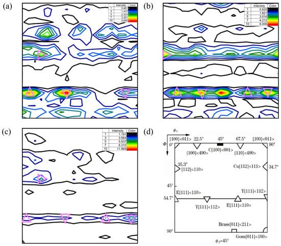 Figure 17 shows the constant φ2 = 45° ODF sections at the surface, 1/4 thickness and 1/2 thickness of the steel plate and cubic crystal system. Comparing the section of φ2 = 45° in Figure 17a–c with that in Figure 17d, it can be seen that there were strong {111}<110> and {111}<112> and weak {112}<110> texture components with diffuse distribution at the surface and 1/4 and 1/2 thicknesses. The formation of {111}<110> and {111}<112> texture components may be related to the rolling deformation mechanism in the γ phase region and the orientation relationship during the transformation from the γ phase to the α phase during the final rolling process. We may be able to draw on the results of the study of ultra-low carbon bake hardening (BH) and IF steel. Guan et al. reported that for the ultra-low carbon high strength BH steel plate, the hot rolling deformation process in the γ phase region was mainly realized by the cross-slip of screw dislocations and the climb of edge dislocations, while the cross-slip of the dislocations depended on the start of the {111}<110> slip system, and the higher rolling temperature allowed the dislocations to climb more easily [21]. As a result of the alternating start of the slip system, weak {110} and other texture components may be formed in the final γ phase structure during the transformation from the γ phase to the α phase. To satisfy the K–S orientation relationship, the {111}<110> and {111}<112> texture components were formed after the transformation. In general, these two texture components were very beneficial to the plasticity of steel plates [22]. Compared with the other two locations, the strength of the {111}<110> texture component at 1/2 thickness was weaker, while the strength of the {111}<112> texture component at the surface was stronger. Wang et al. reported that when the Ti–IF steel was rolled in the α phase region at the 750 °C and 800 °C final rolling temperatures, respectively, the intensity of the {111}<110> texture component formed at 800 °C was lower than that at 750 °C [23]. Accordingly, it can be considered that the weaker {111}<110> texture component at 1/2 thickness of the steel plate was related to the lower final rolling temperature in this study.