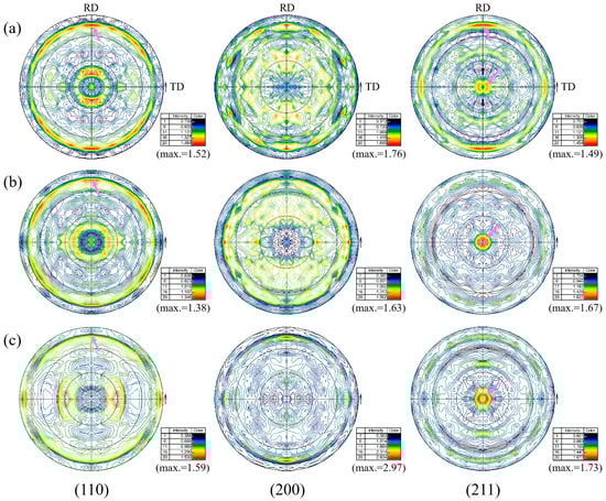 Two-dimensional pole figures at different locations: (a) surface, (b) 1/4 thickness and (c) 1/2 thickness.