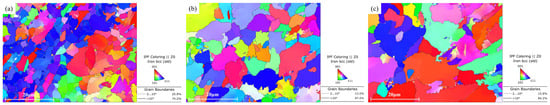 It was generally believed that the energy of the high-angle grain boundary was much higher than that of the low-angle grain boundary, on which most atoms deviated from the equilibrium position. When the cracks propagated to the high-angle grain boundary, they bent multiple times, passing through the high-angle grain boundary due to the irregular arrangement of atoms. As a result, a large amount of crack propagation energy was consumed, so that fracture toughness and fatigue performance was improved [25]. For example, Lambert and Gourgues pointed out that increasing the density of high-angle grain boundaries can prevent cracks from continuing to propagate or change the direction of crack propagation, thereby improving crack arrest toughness. In contrast, the low-angle grain boundary indicated almost no crack propagation [26,27]. Bhattacharjee and Dáz-fuentes found that the grains misorientation angle in the same cleavage plane must be more than 12° or 15°, so as to prevent the crack from propagating [28,29]. Because the grain misorientation angles of the steel plate in this study were all more than 10°, it was predicted that the plate had good toughness and fatigue properties.