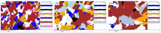 Figure 21 shows the distribution of texture components and their volume percent content of RD-TD cross-sections at different locations of the steel plate. It can be seen from the figure that the texture components of the steel plate mainly included S ({123}<634>), Brass ({110}<112>), Dillamore ({4411}<11118>), <111>//X, <110>//X and <001>//X texture components, where X was the rolling direction. Among these, the <110>//X texture component had the highest content, while the content of Dillamore texture component was very low at 1/4 and 1/2 thickness, so it was not marked in Figure 20b,c. The content of S and Brass texture components decreased gradually from the surface to 1/2 thickness, which was obviously related to the gradual and sufficient recrystallization process (see Section 3.4.2) The content of the <111>//X texture component at 1/4 thickness was obviously higher than that at the other two locations, while the content of the <001>//X texture component at the surface was obviously lower than that at 1/4 and 1/2 thickness. The content of the Brass texture component was low at all three locations and showed a decreasing trend from the surface to 1/2 thickness. The content of the <110>//X texture component increased from the surface to 1/2 thickness, and the content was the highest at the thickness, up to 52.1%, which was consistent with the formation of a strong {001} <110> texture component at 1/2 thickness, seen using ODF analysis (See Section 3.3.2).