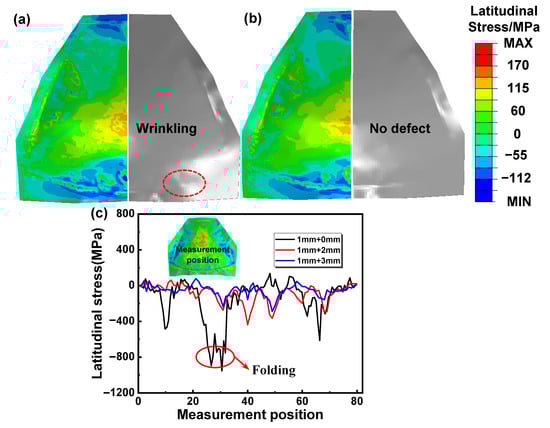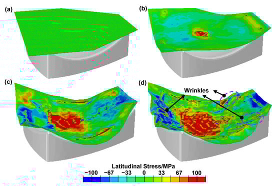 - The thicker upper sheet is beneficial to suppress wrinkling. When the thickness of the upper sheet increases to three times that of the target sheet, a curved-surface component with a smooth surface and no defects can finally be formed. The upper auxiliary sheet can effectively reduce the compressive stress at the edge of the target forming sheet, thus inhibiting the wrinkling defect.