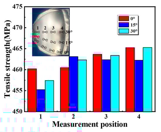 - Full strength can be obtained by die quenching in the two-layer-sheet hot-forming–quenching integrated process. The tensile strength in all regions ranges from 455 MPa to 466 MPa, reaching the full strength of the used material and ensuring uniform quenching.