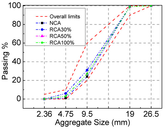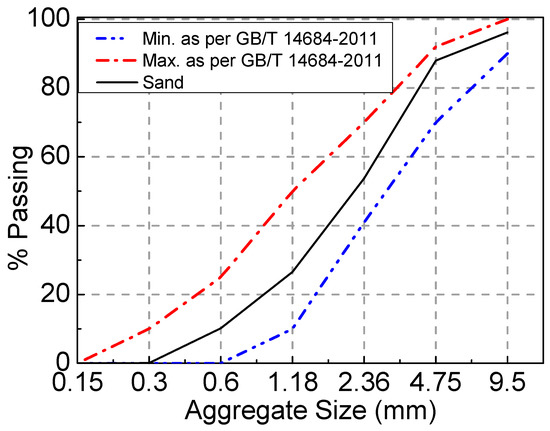Common Portland cement P.O 42.5 was used in the experiment, and its performance meets the GB 175-2007 [28] requirements. The detailed properties of cement are presented in Table 1. The nature coarse aggregate (NCA) was crushed limestone with a particle size of 5~20 mm, and its properties conformed to the stipulations in GB/T 14685–2011 [29]. The recycled coarse aggregate was the waste concrete beam with a strength grade of C40 that was crushed using a jaw crusher and sieved to keep the particle size between 5 mm and 20 mm. The detailed properties of the NCA and RCA are presented in Table 2. Both the NCA and RCA had continuous gradation. As illustrated in Figure 1, the particle–size distribution of coarse aggregates satisfied the limitation in GB/T 14685–2011 [29]. The fine aggregate was river sand with a fineness modulus of 2.75. As illustrated in Figure 2, the particle–size distribution of fine aggregates satisfied the limitation in GB/T 14685–2011 [29]. A superplasticizer with a water-reducing ratio of 25% was used, and its optimum dosage was 1% of the cement weight. The water was tap water. The steel fiber that was hooked at both ends had a tensile strength ≥ 1345 N/mm2, average length (lf) of 35 mm, mean diameter (df) of 0.55 mm, and aspect ratio (lf/df) of 63. The performance indexes of the longitudinal tensile steel bar and stirrups of the test beam were measured according to GB/T 228.1-2010. The ultimate strength, yield strength, and elongation of the steel bars with a diameter of 16 mm were 623 MPa, 483 MPa, and 24%, respectively. The ultimate strength and elongation of the steel bars with a diameter of 8 mm were 493 MPa and 41%, respectively.