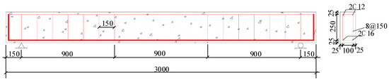 Thirteen reinforced SFRAC beams were made, all of which had a rectangular section of 30 cm × 20 cm (height × width), a length of 300 cm, and a calculated span of 270 cm. The reinforcing bars are shown in Figure 3. The width and height of the beams were 150 mm and 300 mm, respectively. The diameter of the stirrup was 8 mm. Two 12 longitudinal bars were at the bottom, and two 12 steel bars were at the top. The steel bar arrangement is described in Figure 3. The concrete protection layer was 25 mm thick. Each beam was accompanied by three cube compression blocks and three split tensile crack resistance test blocks to measure the concrete compression and the tensile strength.