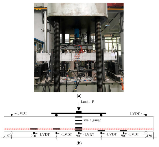Loading and measuring of test beam. (a) Loading photo. (b) Schematic of flexural test setup and locations of LVDTs.