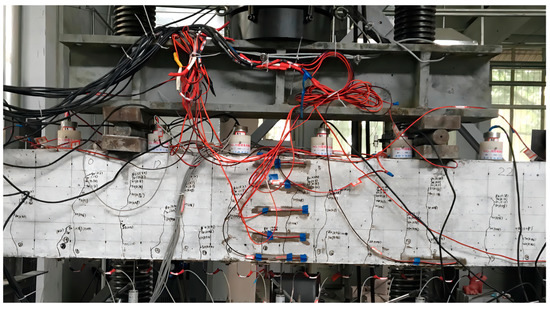 All beams were loaded at four points to failure by the distribution beam on the universal testing machine. The test was carried out according to the loading method and procedure of the Concrete Structure Test Method Standard (GB/T50152-2012) [31]. Before the cracking load, the load was increased by 2.5 kN per level. After cracking, the load was increased by 5 kN per level until the yield load. The load was continuously increased, and the data were collected until the beam specimen was destroyed. Ten YWC-100 resistive displacement sensors were used to monitor the deformation. The loading method and the measurement arrangement are described in Figure 4. Five concrete strain gauges 100 mm long were evenly arranged from top to bottom in the middle of the span. A steel strain gauge 5 mm long was fixed at the main reinforcing bar span in the longitudinal direction. The schematic diagram of the equipment is shown in Figure 4.