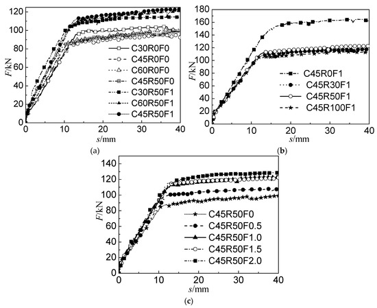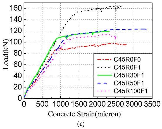 The basic mechanical properties test of SFRAC and the bond performance test of the steel bar and SFRAC demonstrate that the compressive strength of SFRAC and the bond strength of the steel bar and SFRAC decrease with the increasing replacement rate of recycled aggregate. When the ultimate bending state is reached, the bond strength between the steel fiber and the concrete spanning the crack in the tensile region of the SFRAC beam decreases with the increasing replacement ratio of the recycled aggregate, and the tensile force of the steel fiber decreases. Meanwhile, the compressive strength of concrete at the compression part of the beam also decreases, making the ultimate bearing capacity of the SFRAC beam lower than that of the steel fiber ordinary concrete beam. Figure 8c presents the RC beam load concrete stress–strain relationship with the recycled aggregate replacement rate of 50% and different steel fiber volume fractions. Adding steel fiber can enhance the ultimate compressive strain corresponding to the ultimate load and increase the strain when the recycled concrete is crushed from 0.0028 (no steel fiber) to 0.0046 (steel fiber volume fraction 2%), which is consistent with a study conducted by Oh [34].