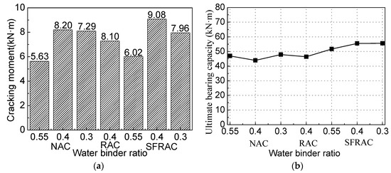 According to the test results in Table 4, the effects of the water–cement ratio on the cracking moment of the beam are shown in Figure 7a. The cracking moment of the RAC beam is lower than that of the ordinary concrete beam with the same water–cement ratio, which is consistent with previous studies [8]. However, when the recycled concrete is added to the steel fiber, its cracking moment is greater than that of the ordinary concrete beam with the same water–cement ratio. As the water–cement ratio decreases, the cracking moment of the SFRAC beam increases. The decrease in the water–cement ratio decreases the internal porosity of the recycled concrete, increases the effective cross-sectional area, and enhances the tensile capacity of SFRAC.