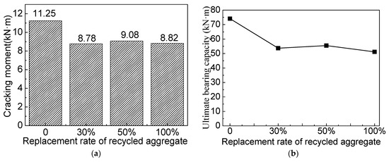 Comparison of test results for beams with different replacement ratios of RCA. (a) Cracking moment. (b) Ultimate bearing capacity.