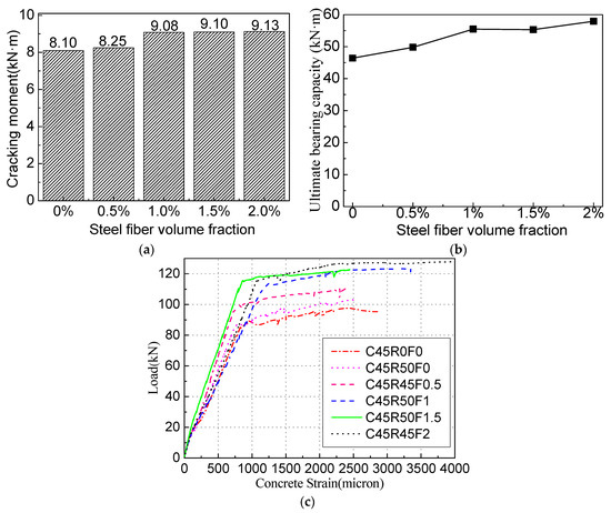 Comparison of test results for beams with different steel fiber volume fractions. (a) Cracking moment. (b) Ultimate bearing capacity. (c) Concrete strain.