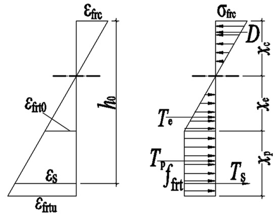 In order to establish a calculation model of crack resistance and the bearing capacity of the normal section of the SFRAC beam, the elastic–plastic steel stress–strain relationship model is used based on the assumption of the flat section. ; the ultimate tensile strain of the longitudinal tensile steel bar is 0.01. The compressive stress–strain relationship of SFRAC in [37] is adopted, and the contribution of SFRAC at the tensile part of the beam section is considered.