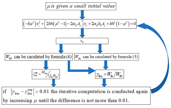 The procedure to calculate γrfm is shown in Figure 11. For a given SFRAC beam, b, h, As, and αE are known. When μ is obtained, xc, , and can be calculated. can be obtained according to Formula (4). As shown in Figure 11, μ is given a small initial value, and then and are obtained. If the difference between and is greater than 0.01, the iterative computation is conducted again by increasing μ until the difference is less than 0.01. The calculation is terminated, and the final value of μ is obtained. The calculation process is cumbersome, and the calculation program is compiled. The calculation and analysis results of the test data are listed in Table 5. It can be found that the height of the plastic zone of the SFRAC beam is about 0.31~0.56 times the height of the entire tension zone.