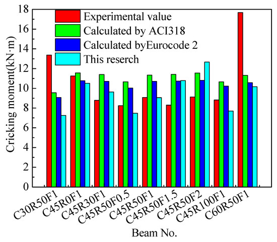 ACI 318 [36] and Eurocode 2 [39] provide formulas for calculating cracking moments. The calculated values are shown in Figure 12. It can be seen that the calculated values of the cracking moment of beams based on ACI 318 [36] and Eurocode 2 [39] are greater than the experimental values except for beams C30R50F1, C60R50F1, and C45R0F1. The method presented in this paper agrees with the experimental results. Except for beams C30R50F1 and C60R50F1, the cracking bending moments calculated using Formula (3) are close to the test results. However, there are few experimental data that need further research.