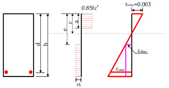The test beam’s cracking moment is calculated using ACI 544.4R-88 [35] and ACI 318-14 [36]. The typical stress–strain distribution of the SFRAC beam is shown in Figure 10.