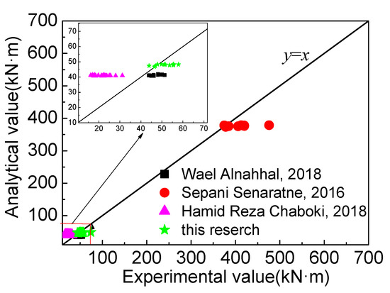 The calculation results of the data in the existing literature are shown in Figure 14. It is obvious that the test deviation of Hamid Reza Chaboki [26] is relatively large, and the section is a shallow beam with a size of 150 mm × 300 mm. The calculation value is relatively large, and the other values are in agreement. The mean value of the ratio of the calculated value to the measured value is 0.90, the mean square error is 0.07, and the coefficient of variation is 0.08.