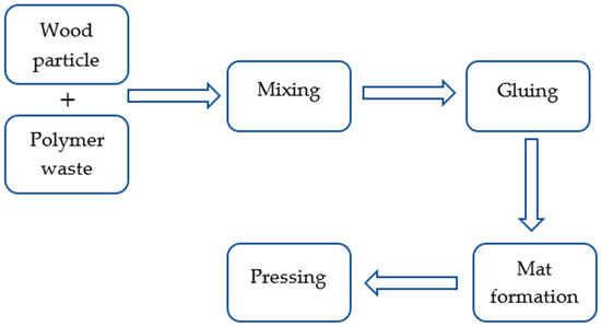 It was decided to produce boards with a density of 650 kg/m3 and 700 kg/m3, and to replace the wood particles with polymer particles at an amount of 20% and 40% (the dry weight of chips to the dry weight of ground blades). When added to the wood particles, the ground blades’ moisture content was 0.9 ± 0.2%. Wood particles with an initial moisture content of 5.7 ± 0.3% were dried to a moisture content of around 2.7%. Moisture content was measured by using the drying-weighing method. The mixture of wood–polymer particles was combined using the pneumatic application of glue. The gluing degree was assumed to be 8% (the dry weight of the adhesive to the dry weight of the charge) for boards with a density of 650 kg/m3 and 6% for boards with a density of 700 kg/m3 (the dry weight of the glue to the dry weight of the wood (for the 80% wood content)). The scheme of the board manufacturing process is shown in Figure 2.